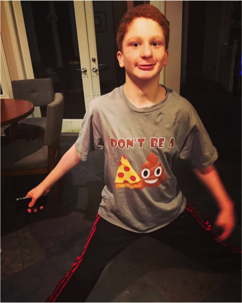 Teenager Nate mugging for the camera, wearing a t-shirt with the image of a pizza slice and poop emoji.Nate is a tall, mouthy teenager now. He loves zombies, horror movies, and sneaking air kisses in the direction of his girlfriend when no one is looking.