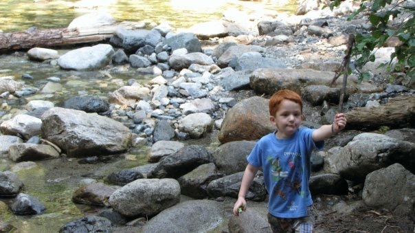 Nate as a young boy, walking along a rocky river bed, waving a stick.