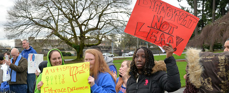 Front of Legislative Building in Olympia. Crowd of disability advocates waving signs on the front steps.