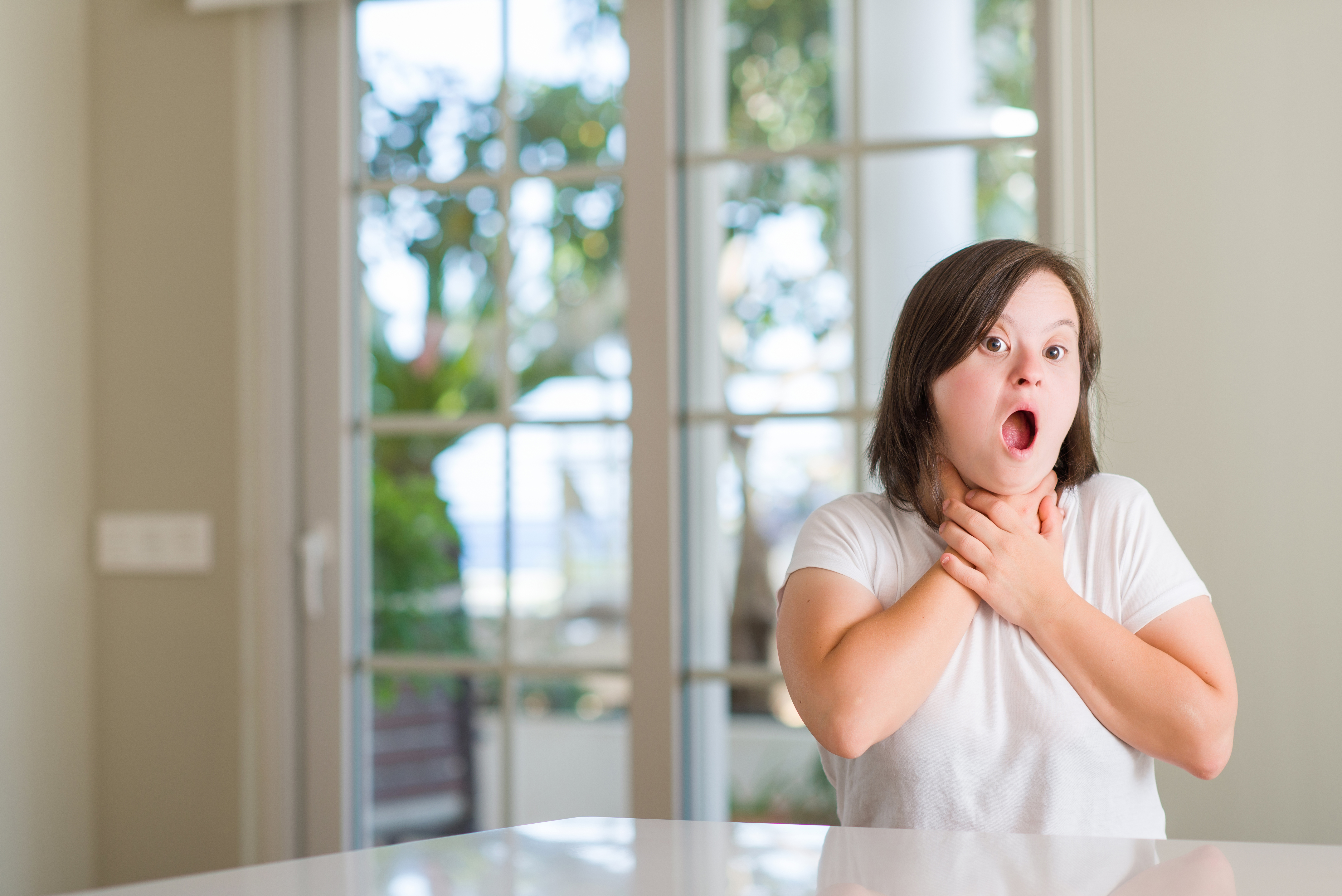 Down syndrome woman at home, holding hands to throat, indicating choking.