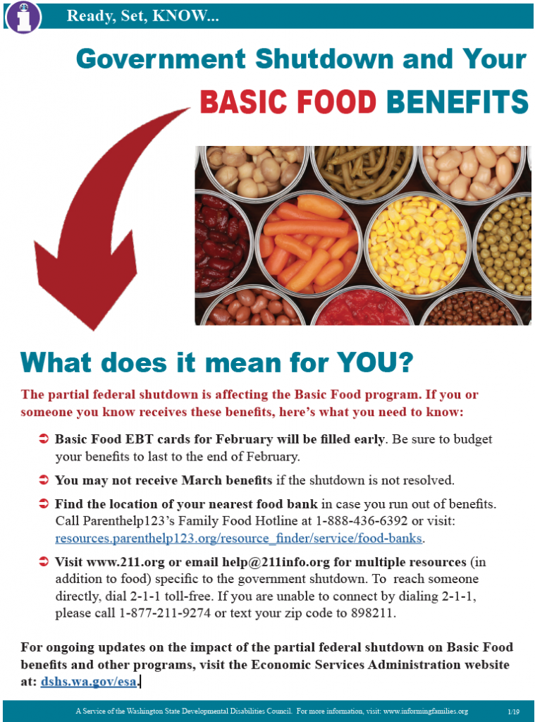 For ongoing updates on the impact of the partial federal shutdown on Basic Food benefits and other programs, visit the Economic Services Administration website.