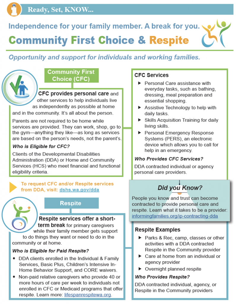 CFC provides personal care and other services to help individuals live as independently as possible at home and in the community. It’s all about the person. Parents are not required to be home while services are provided. They can work, shop, go to the gym—anything they like—as long as services are based on the person’s needs, not the parent’s.
