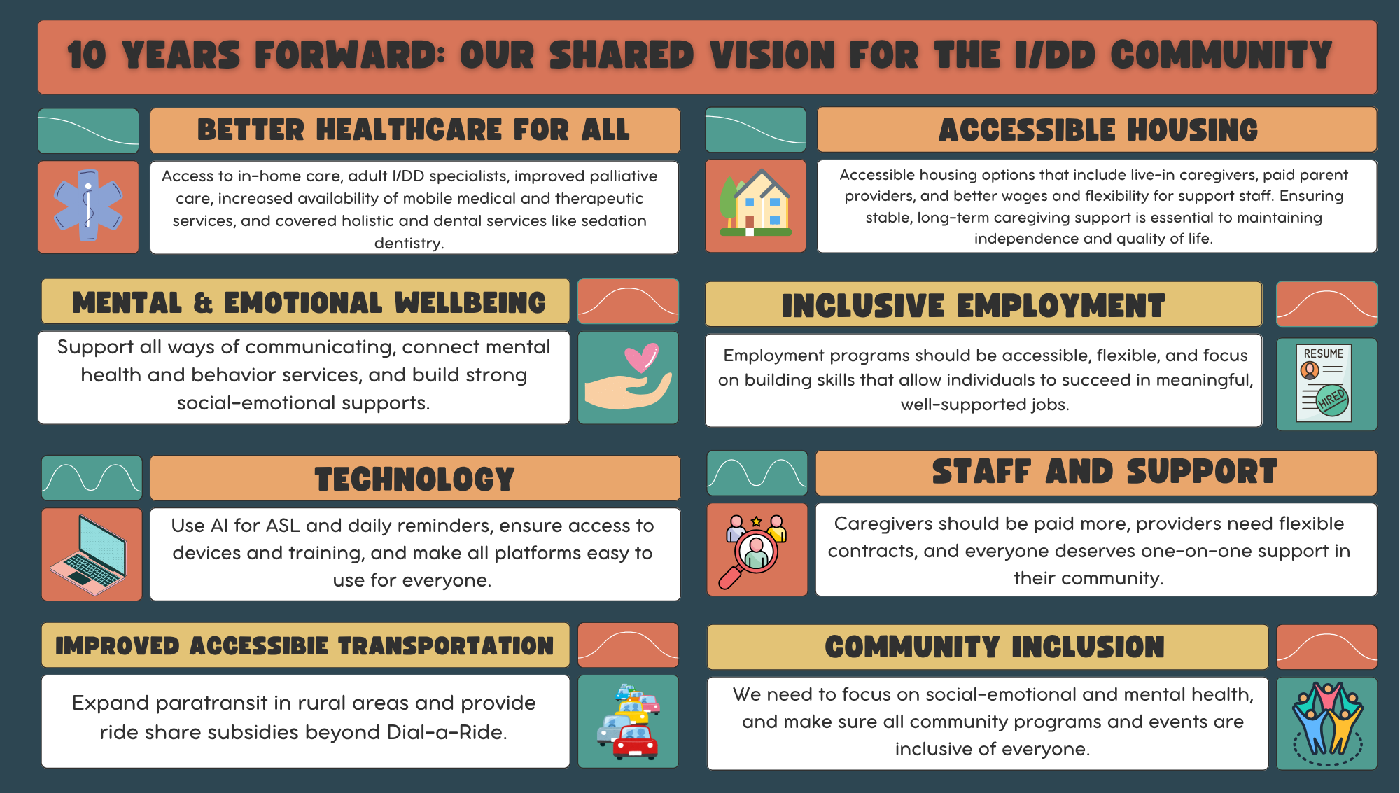 The second breakout session focused on the future of the I/DD community in Washington State. It was an interactive conversation where participants reflected on the past and looked ahead to what’s next. Guided by speakers and supported by a Graphic Facilitator, the session began with a brief history of the I/DD community and the progress made over time. From there, the group shifted into envisioning the future, discussing ways to reduce barriers, strengthen supports, and create more inclusive communities. Key takeaways included a deeper understanding of the community’s journey, ideas for continued improvement, and clear action steps participants could take moving forward.