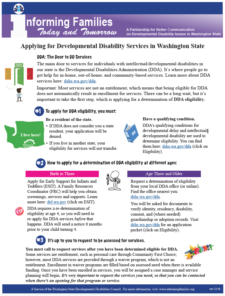 The main entry point to services for individuals with intellectual/developmental disabilities in our state is the Developmental Disabilities Administration (DDA). It’s where people go to get help for in-home, out-of-home, and community-based services.