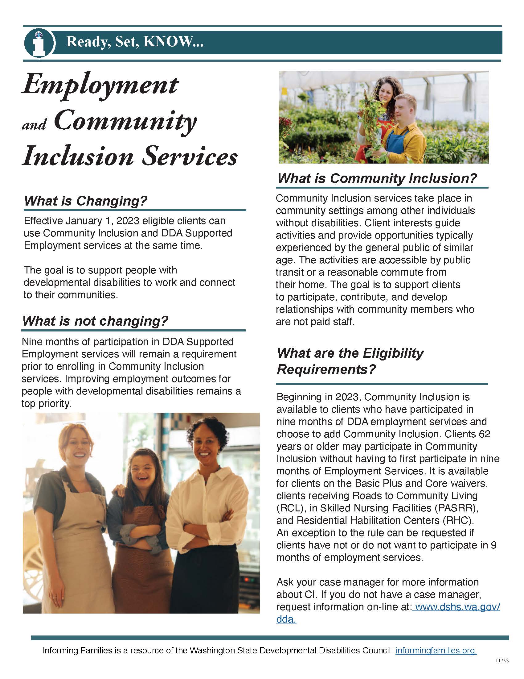 Effective January 1, 2023 eligible clients can use Community Inclusion and DDA Supported Employment services at the same time. The goal is to support people with developmental disabilities to work and connect to their communities.
