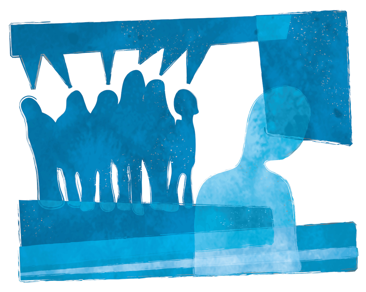 cut outs of a crowd in background. Foreground cutout of a single person. All cutouts in shades of blue.