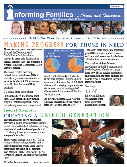 Image of the newsletter cover with Informing Families banner and headlines that read Making Progress for those in Need and Creating a Unified Generation.Making Progress for Those in Need