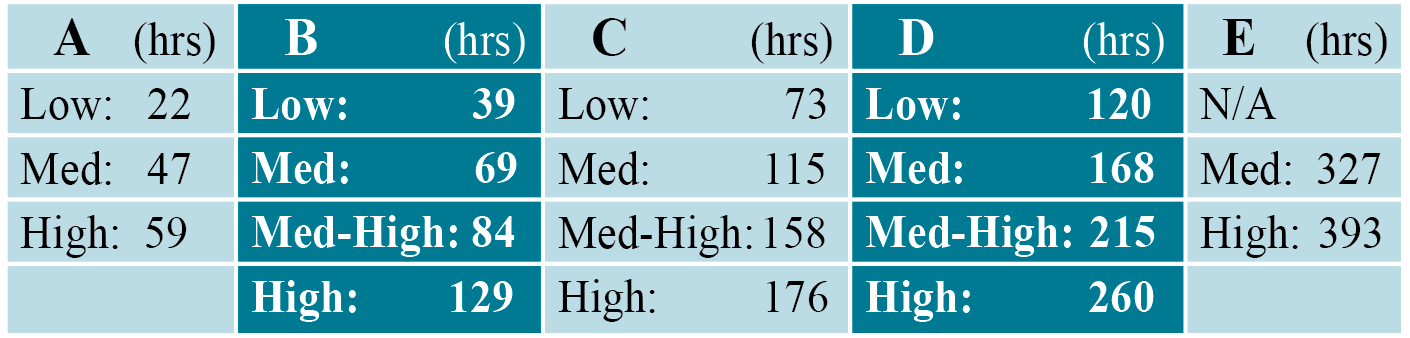 Shaded table with five columns (A through E), each row shows the number of base hours for the different levels within each classification. A low has 22 hrs. A medium has 47 hours. A high has 59 hours. B low has 39 hours. B medium has 69 hours. B medium-high has 84 hours. B high has 129 hours. C low has 73 hours. C medium has 115 hours. C Medium-High has 158 hours. C high has 176 hours. D low has 120 hours. D medium has 168 hours. D medium-high has 215 hours. D high has 260 hours. E has two levels. E medium has 327 hours and E high has 393 hours.