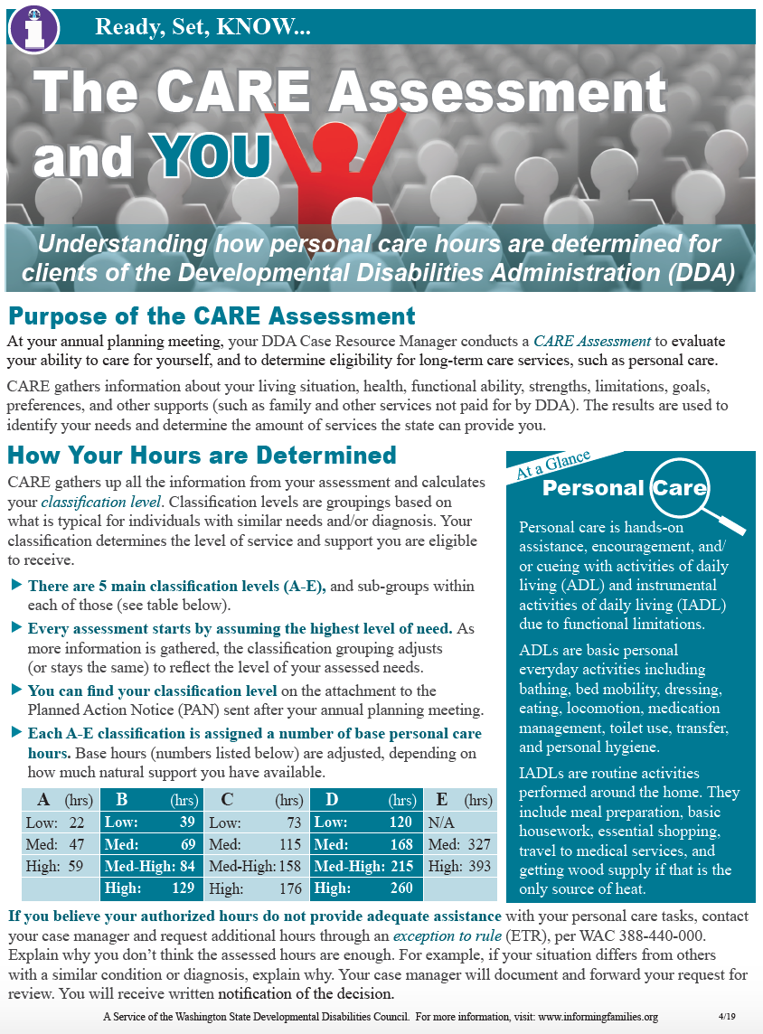 CARE gathers information about your living situation, health, functional ability, strengths, limitations, goals, preferences, and other supports (such as family and other services not paid for by DDA). The results are used to identify your needs and determine the amount of services the state can provide you.