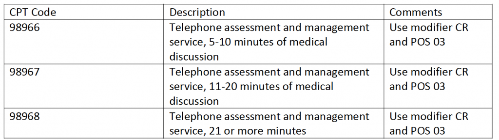 A. When using the telephone to deliver services (audio-only/no visual component), providers do not use existing SBHS codes found in the SBHS Billing Guide. Instead, providers will use the following CPT codes, modifiers, and place of service (POS) to bill for phone-only services: