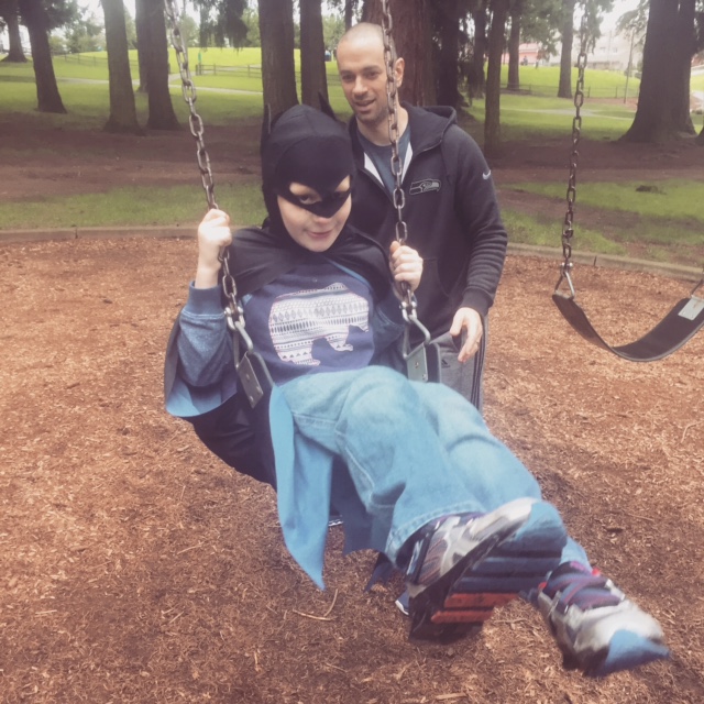 Father pushing son on a swing. Son is dressed as batman.