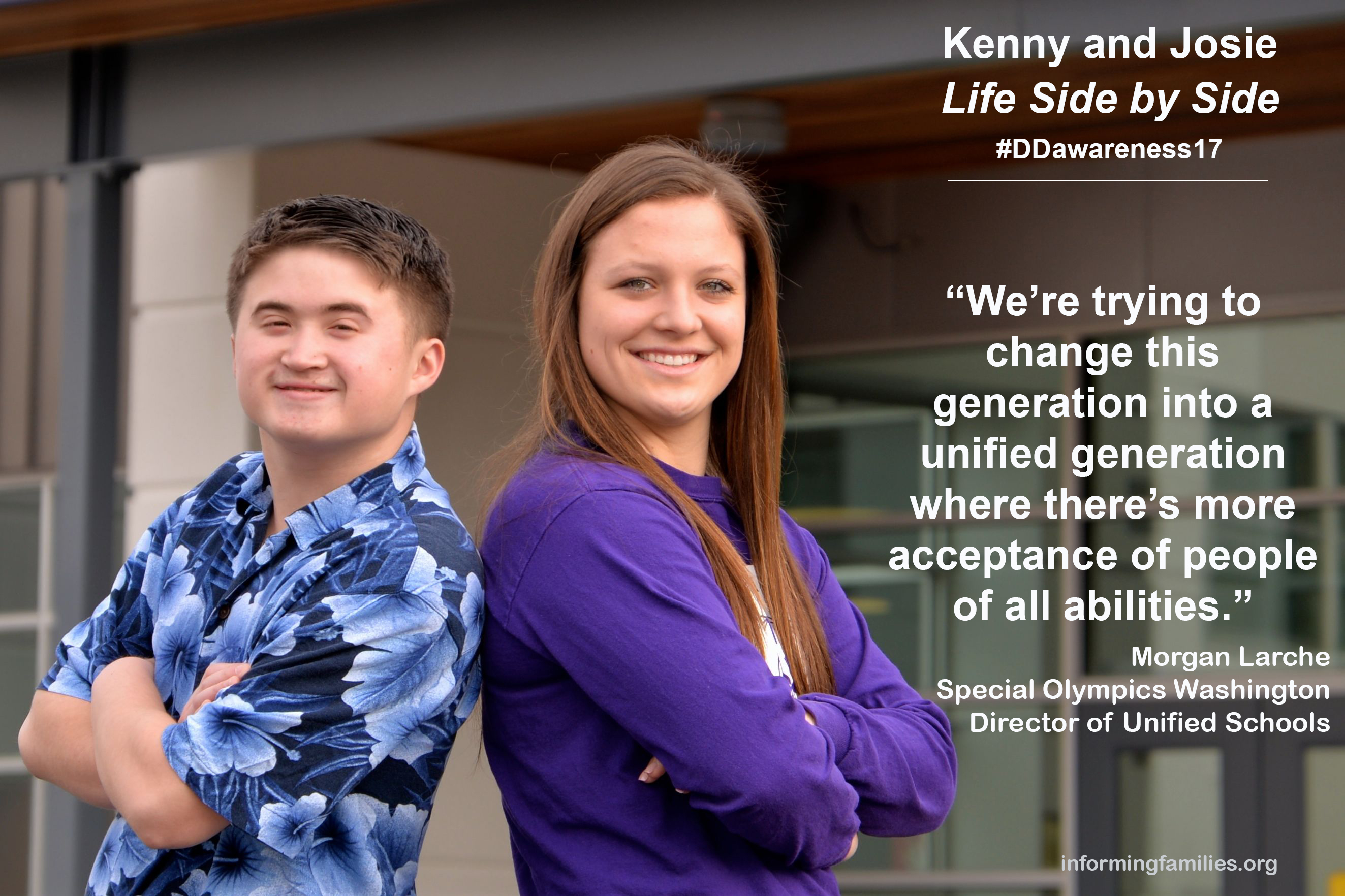 two high school students standing side by side, with quote from Special Olympics Washington Unified Schools Director Morgan Larche
