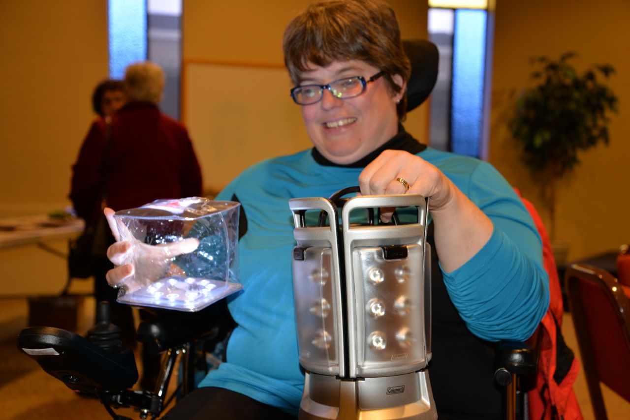 Emily compares her old, heavy portable light with a new inflatable lighted cube that attaches to the back of her wheelchair.
